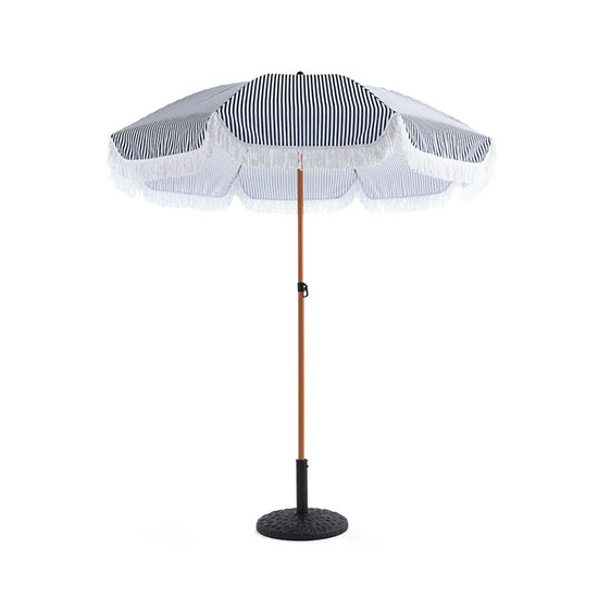 Difficile de ne pas craquer pour le charme rétro de ce parasol rayé à franges.
