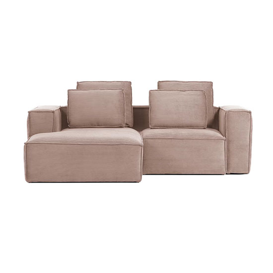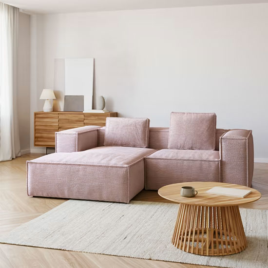 Voici un élégant canapé rose aux formes géométriques et revêtu de velours côtelé.