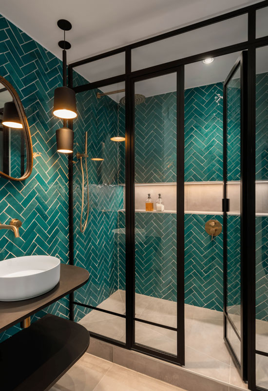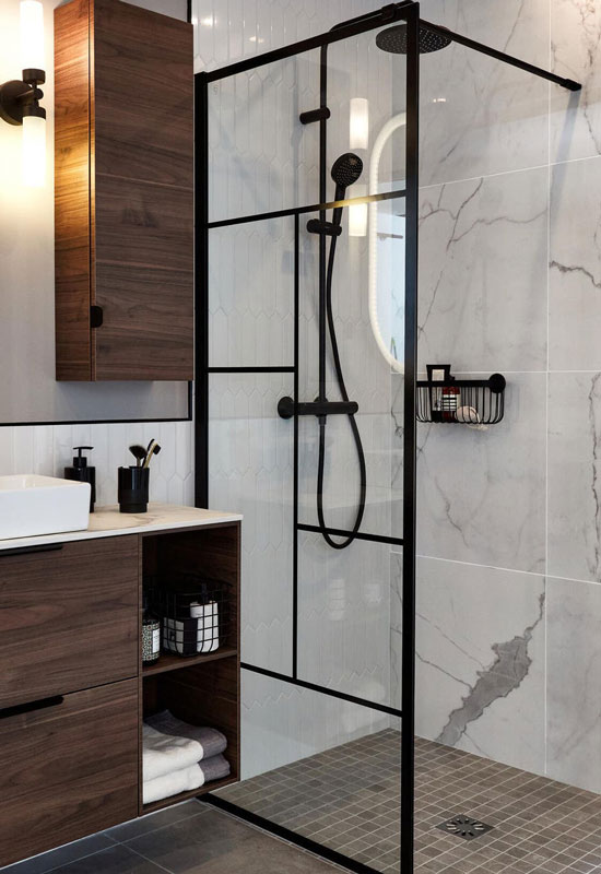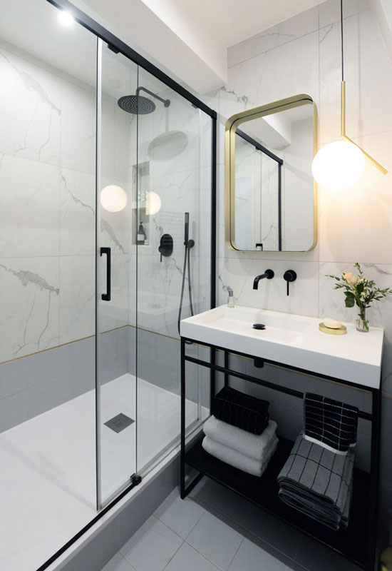 L’intégration d’une douche avec une paroi en verre de style verrière est une astuce élégante pour optimiser une petite salle de bain.