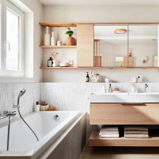 Maximisez l’espace autour de la baignoire en installant des étagères ou des niches murales pour le rangement.