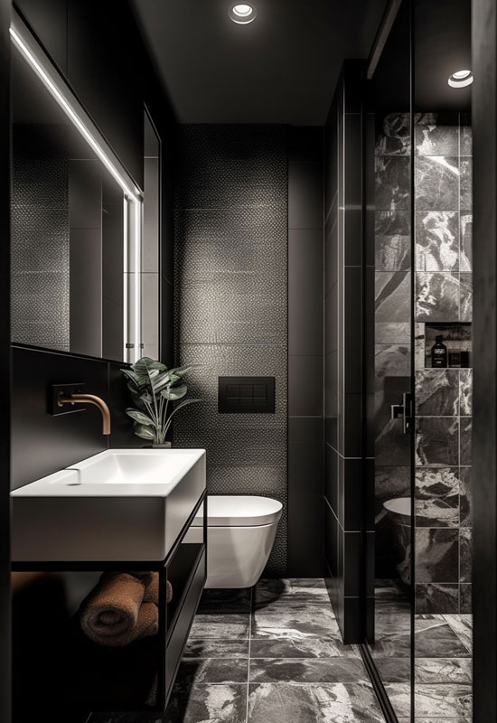 Les couleurs sombres, comme la couleur noire ne sont pas à proscrire pour autant : dans ce cas, multiplier les points de lumière, jouer sur les accessoires et la robinetterie en métal pour réfléchir la lumière.
