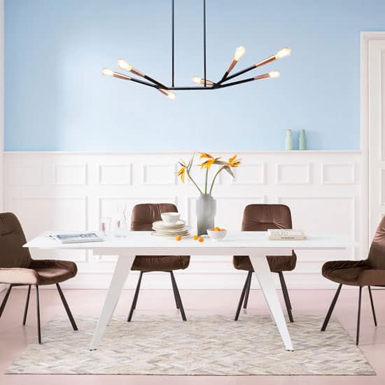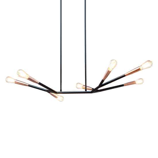 Ce plafonnier composé de 7 ampoules E27 en métal noir et cuivre, est composé de multiples bras rayonnants aux embouts éclairants.