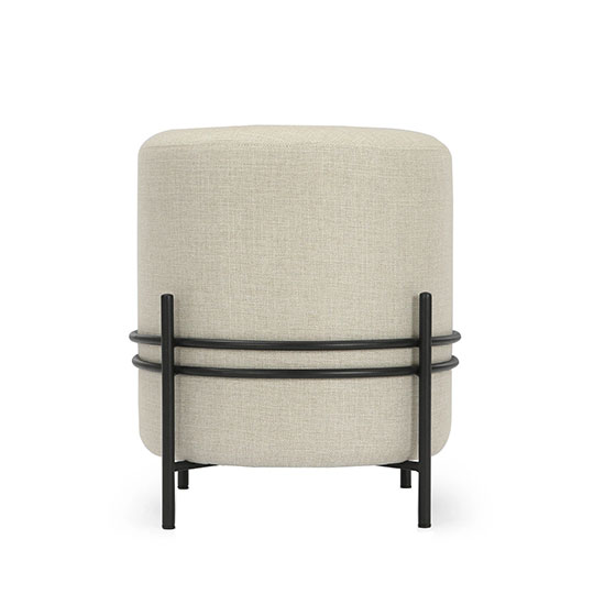 Voici un joli pouf rond au design moderne qui allie tissu écru et métal noir.
