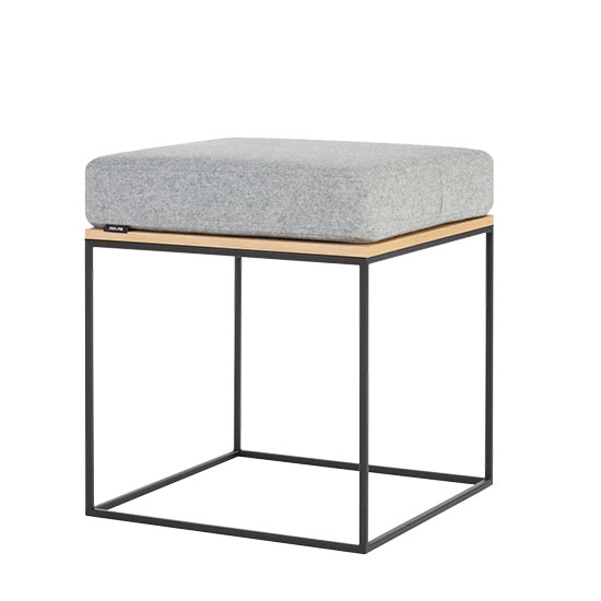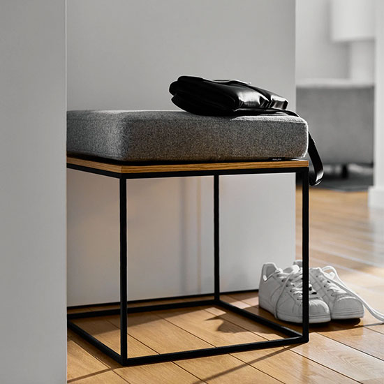 Ce pouf carré aux airs de petit banc d’appoint se compose d’une structure en métal et d’une plateforme en chêne soutenant un coussin en tissu.