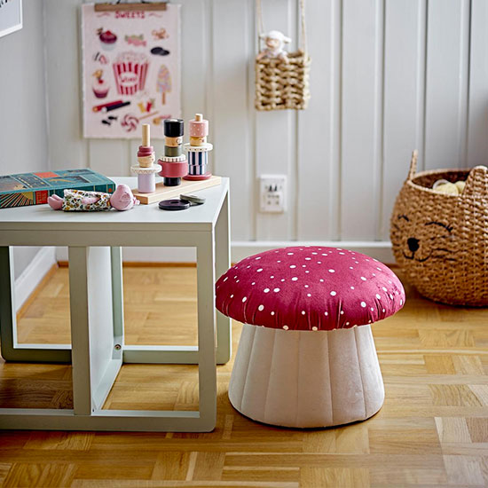 Avec ses 37 cm de haut, son pied bien large et son chapeau rembourré, ce pouf fait aussi office de parfait tabouret enfant.