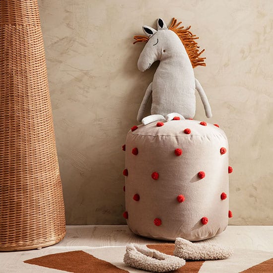 Pour une chambre d’enfant à la déco pétillante, ce tabouret pouf bicolore à pompons est tout indiqué !