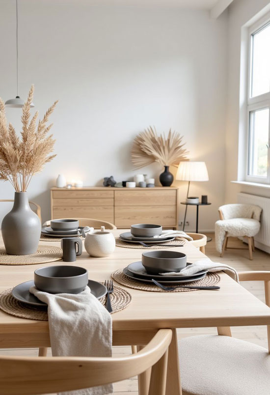 Des vases en céramique, des bougeoirs minimalistes ou des paniers en osier renforcent l’esthétique scandinave.