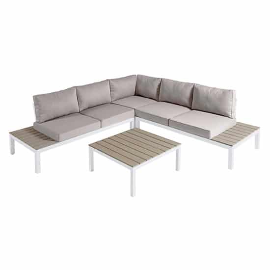 La structure est en aluminium blanc satiné tandis que des lames imitent le bois pour un rendu moderne et robuste.