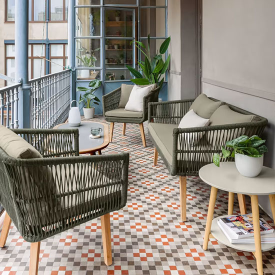 Un tapis d’extérieur dans un ton chaud, couleur terracotta, sur lequel s’expose le salon de jardin et un splendide fauteuil suspendu en rotin.