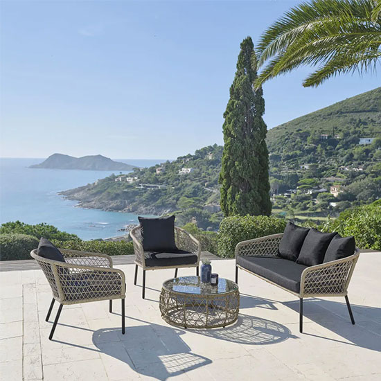 On pourra compléter ce salon d’extérieur avec un fauteuil de jardin design, un luminaire et un bel aménagement paysager.