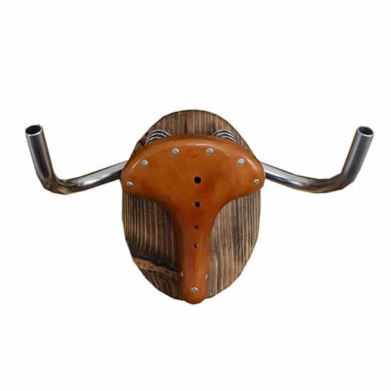 Véritable sculpture faite de pièces détachées de bicyclettes, l’association de la selle et du guidon constitue le support mural pour vélo.