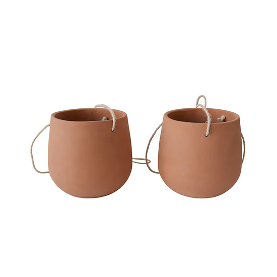 Description : Un duo de pots suspendus en terre cuite, à l'aspect brut et authentique et au coloris chaleureux.