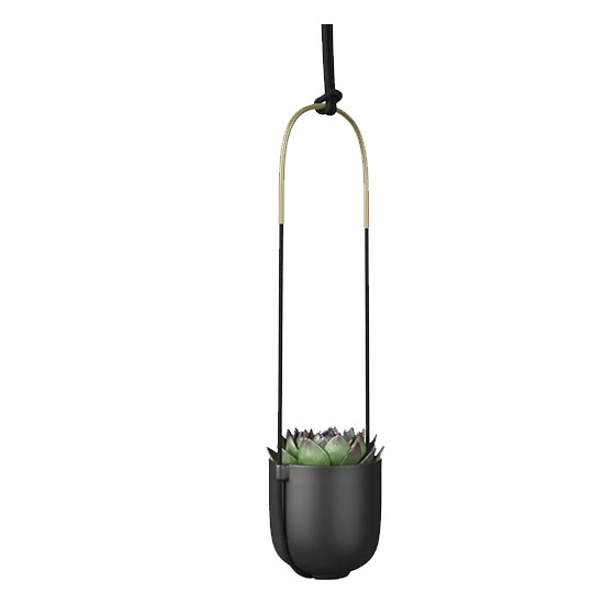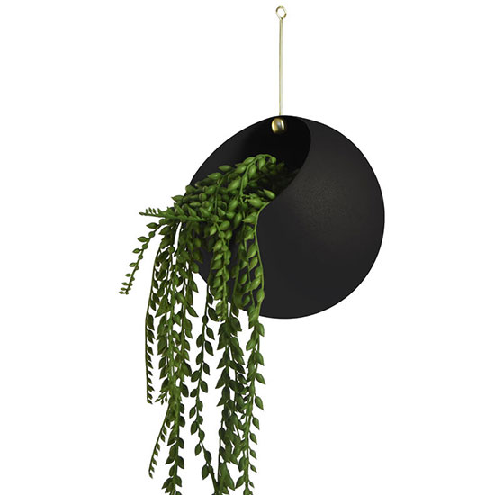 En métal noir mat, ce pot de fleurs de 21 cm de diamètre est doté d’un système d’accroche discret en métal doré.
