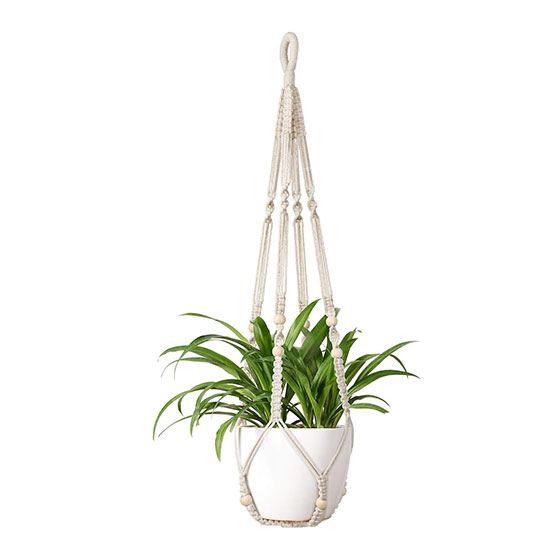 Le support en macramé est tissé en corde de coton et orné de perles, dans un look vintage et bohème.