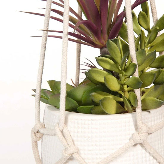 L’objet décoratif se compose d’un pot en céramique soutenu par un tissage en macramé beige à suspendre, accueillant une imitation de plante succulente.