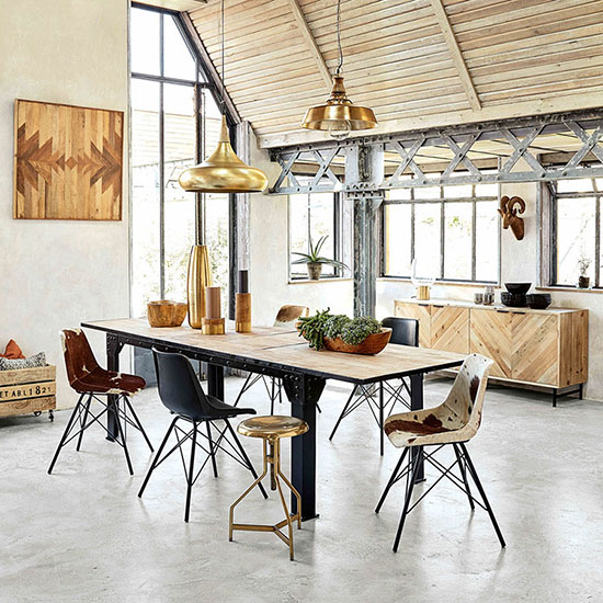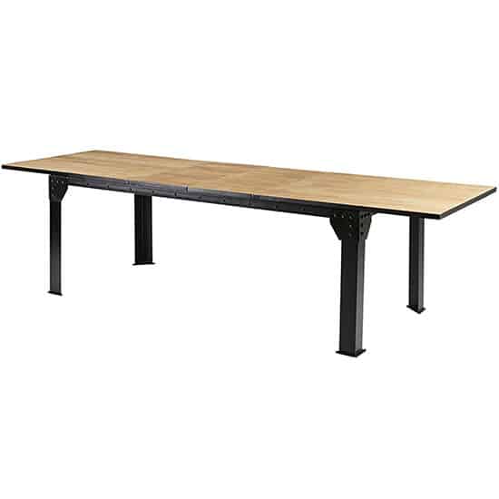 Une table en bois et pieds en métal avec rivets apparents, véhicule un authentique esprit factory.