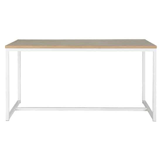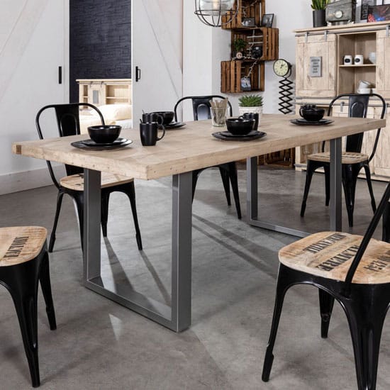 Elle dispose d’un plateau en pin légèrement brossé et d’un piétement en acier noir mat, qui donnent à cette table un style épuré.
