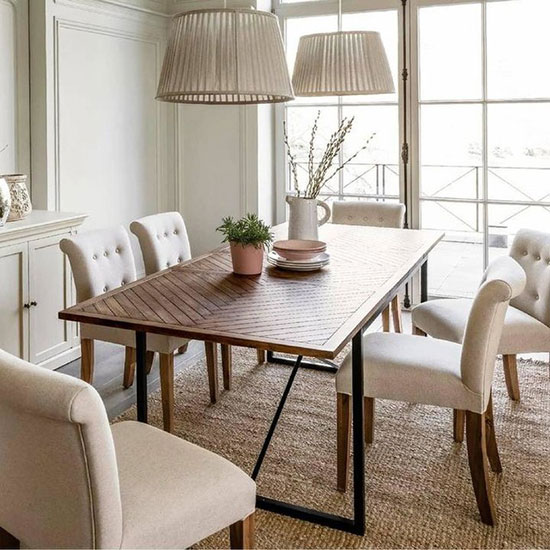La table de salle à manger Long Island de Maisons du Monde, associe bois de sapin et métal pour un rendu chic et harmonieux.