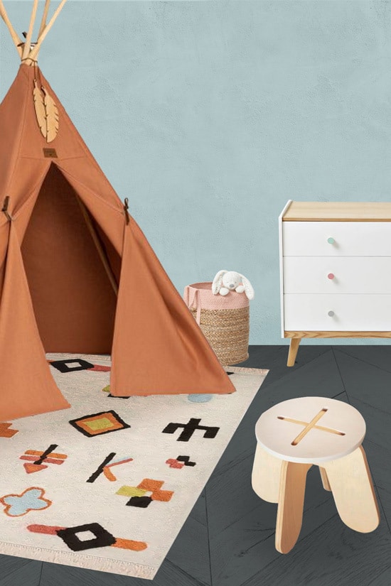 Pour un coin jeu fun et stylé, placez-les sur un tapis motif géométrique coloré !