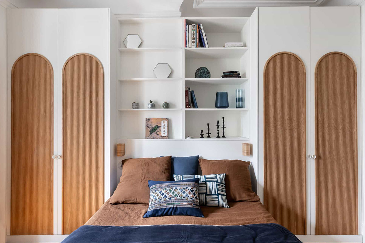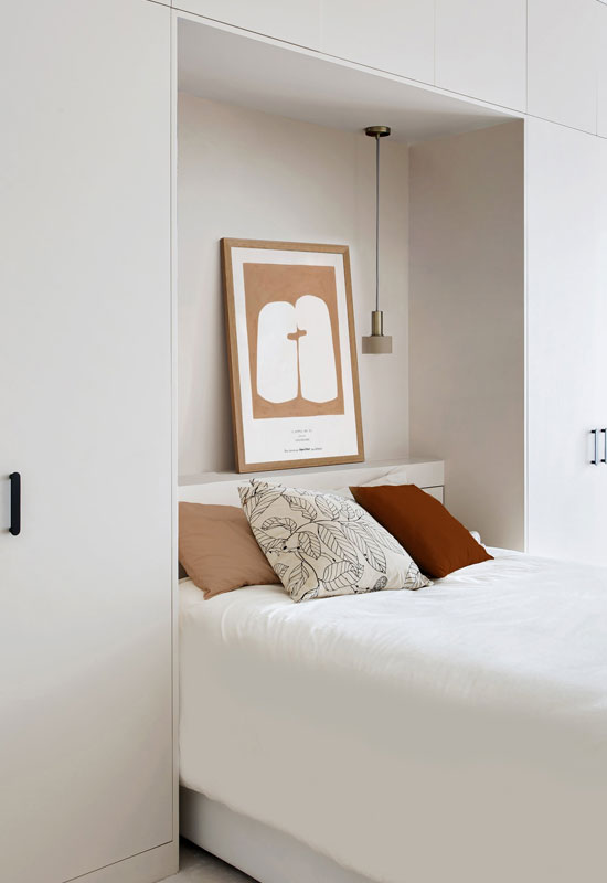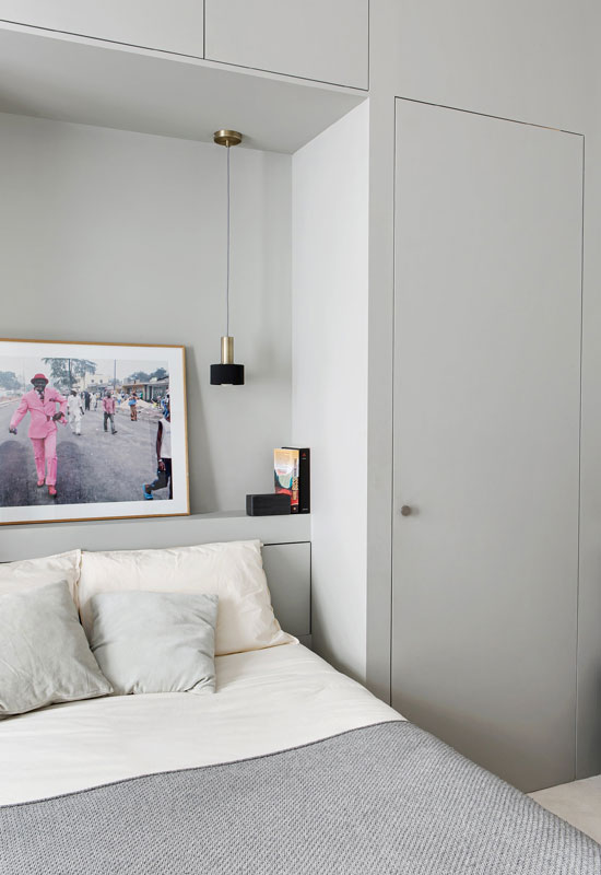 Ne surchargez pas l’espace et intégrez uniquement quelques éléments essentiels : lit, chevets, luminaires.