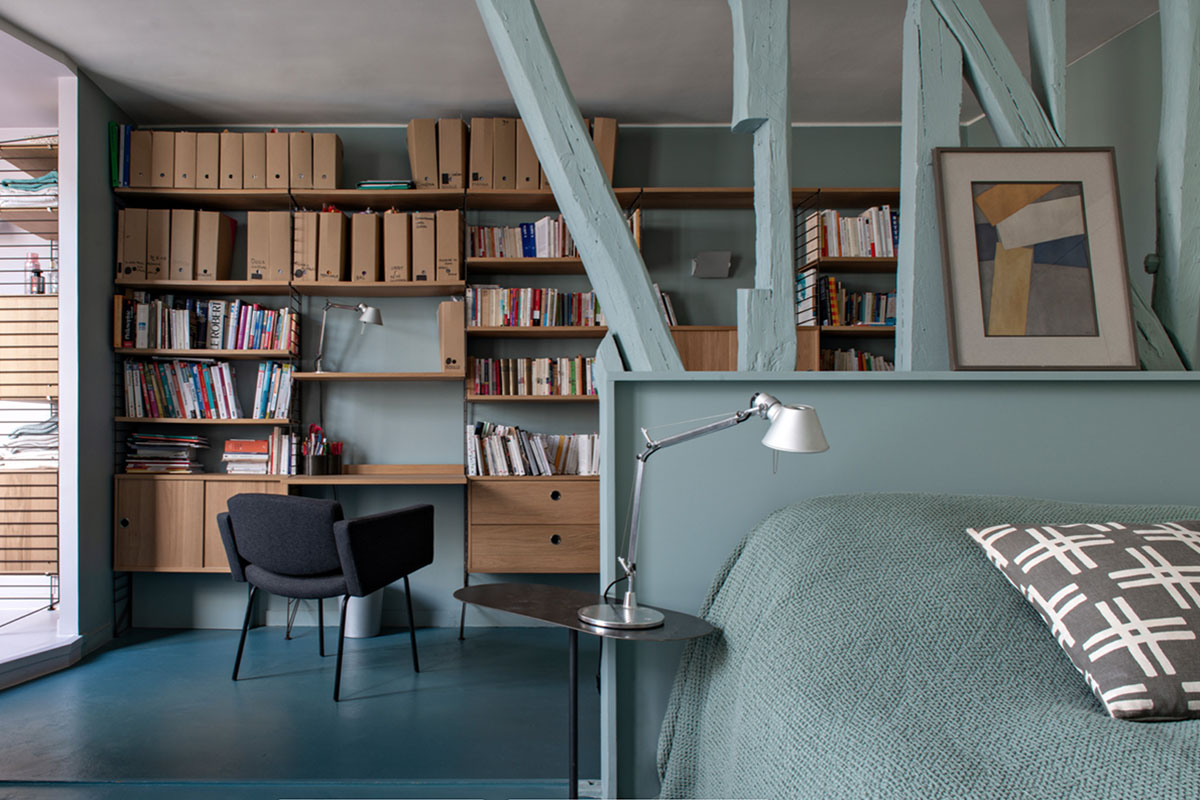C’est un bleu que l’on peut utiliser pour structurer l’espace et pour s’amuser en jouant par exemple avec la peinture.