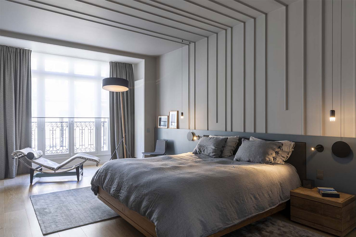 Avec une couleur foncée, soignez l’éclairage de chambre à coucher avec des luminaires élégants en laiton brossé ou opaline par exemple.