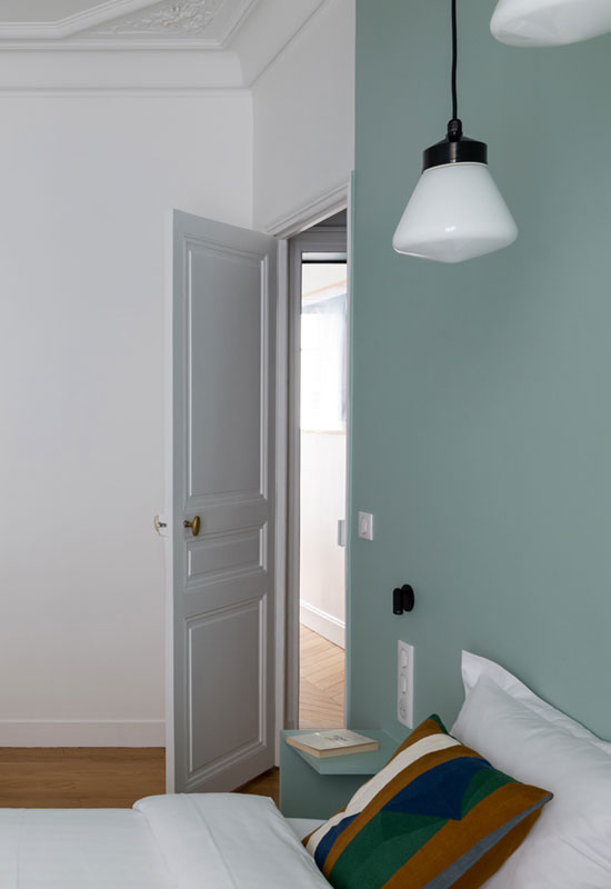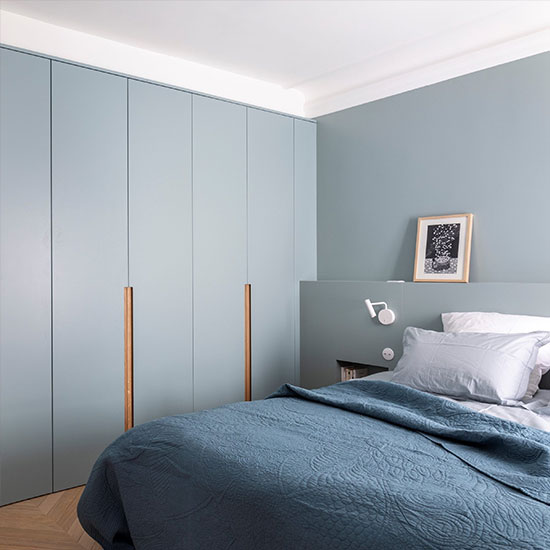 Tirant parfois vers le gris clair, le bleu est une teinte particulièrement élégante pour la chambre.