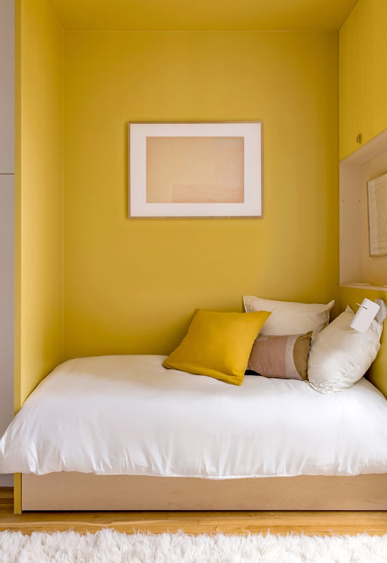 Si la chambre manque de lumière naturelle, le jaune réfléchira la lumière, amplifiant ainsi la luminosité et aussi l’espace perçu.