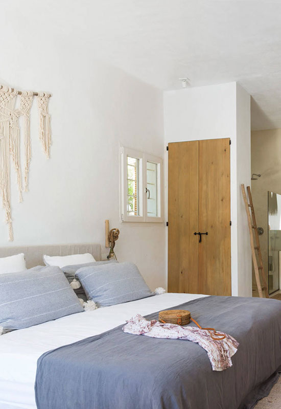 Une tête de lit en bois, un tapis en jute, quelques paniers et des nuances de beige et de bleu vous feront aussi rapidement voyager !