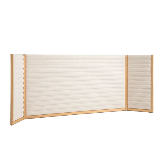 Sa partie centrale revêtue de tissu chiné beige est encadrée par 2 pans en bois foncé à l’esthétique noble et précieuse.