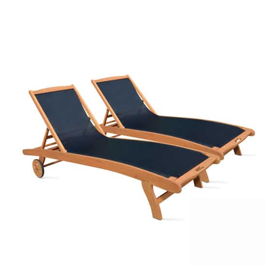 Ce lot de 2 bain de soleil propose une structure en bois d’eucalyptus huilé, garnie d’une toile de transat noire.